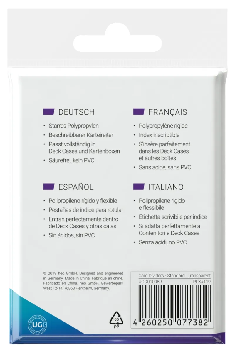 Organiza tu colección de cartas de forma práctica y elegante con los Separadores de Cartas de Ultimate Guard. Perfectos para separar mazos, clasificar expansiones o dividir tus cartas por tipo o rareza.