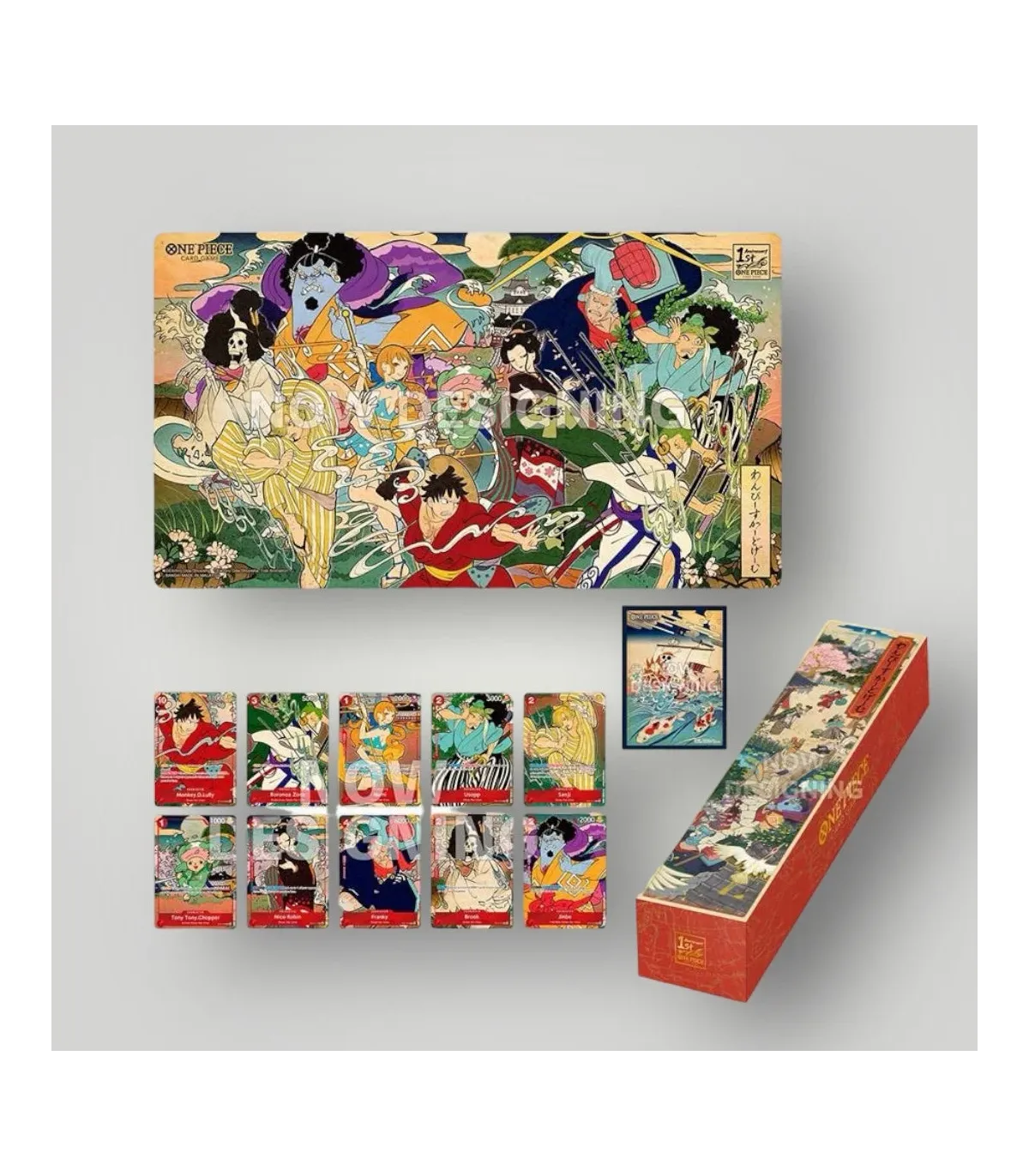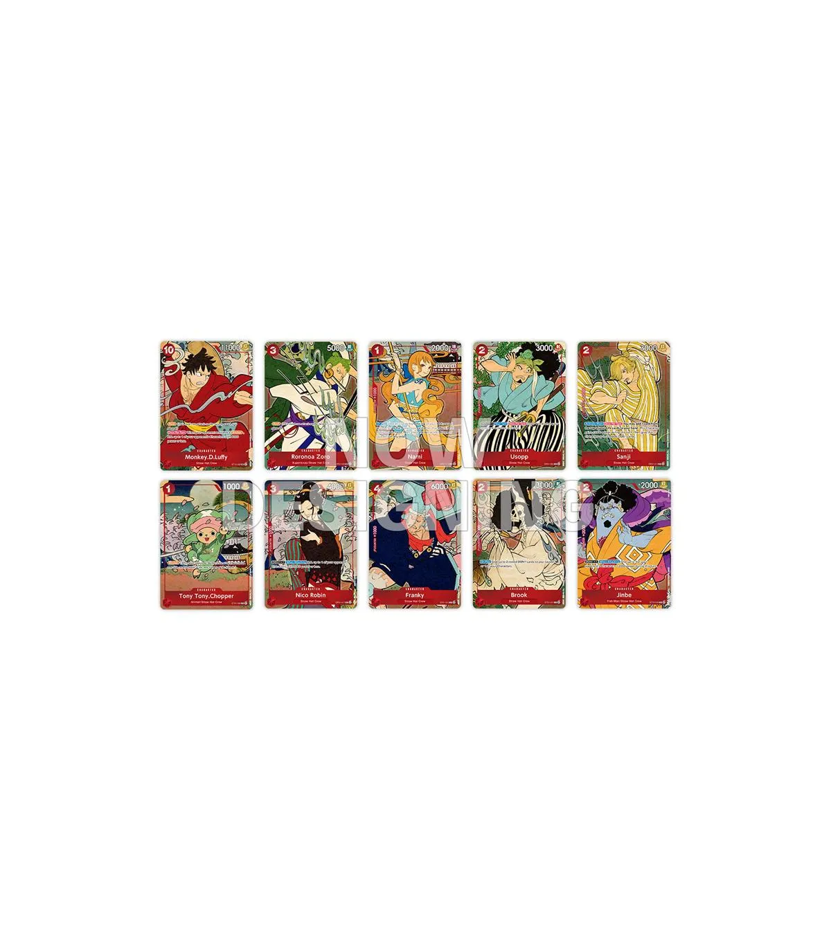 • 10 cartas promocionales con Arte Alternativo (AA) de todos los Sombrero de Paja: Monkey D. Luffy, Zoro, Nami, Usopp, Sanji, Chopper, Robin, Franky, Brook y Jinbe.