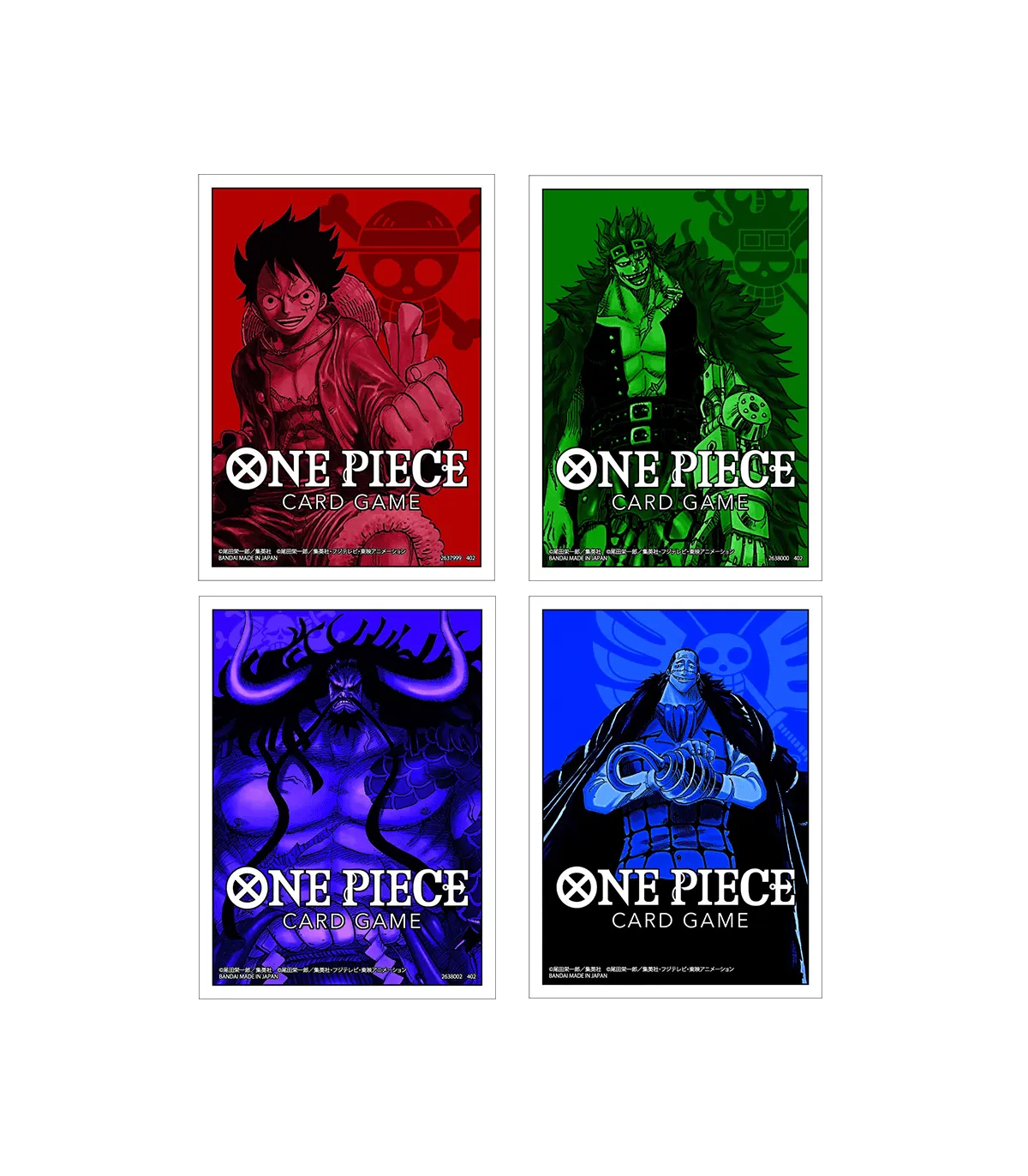 Llegan las fundas oficiales de One Piece TCG, el tamaño perfecto para poner tus cartas de One Piece con el arte y color de los primeros Starter Deck: Luffy, Eustass Kid, Crocodile y Kaido.