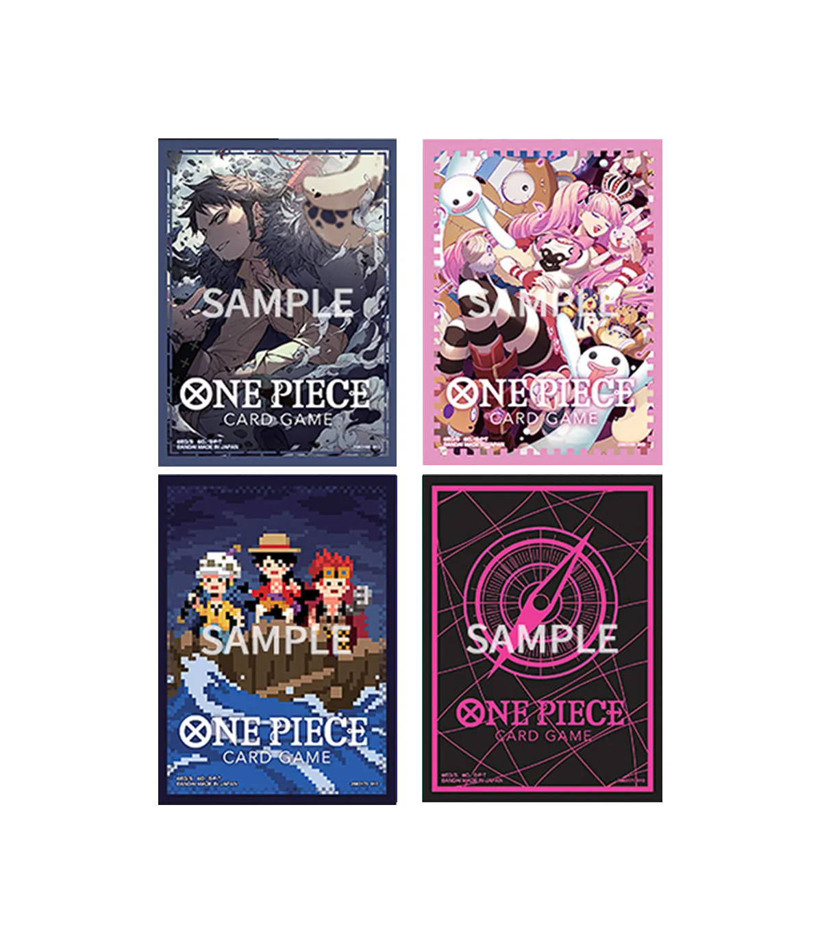Llegan las fundas oficiales de One Piece TCG, el tamaño perfecto para poner tus cartas de One Piece con el arte y color de Trafalgar Law, Perona, los 3 Capitanes (Law, Luffy y Kid) y el logo de One Piece Card Game en rosa con fondo negro.