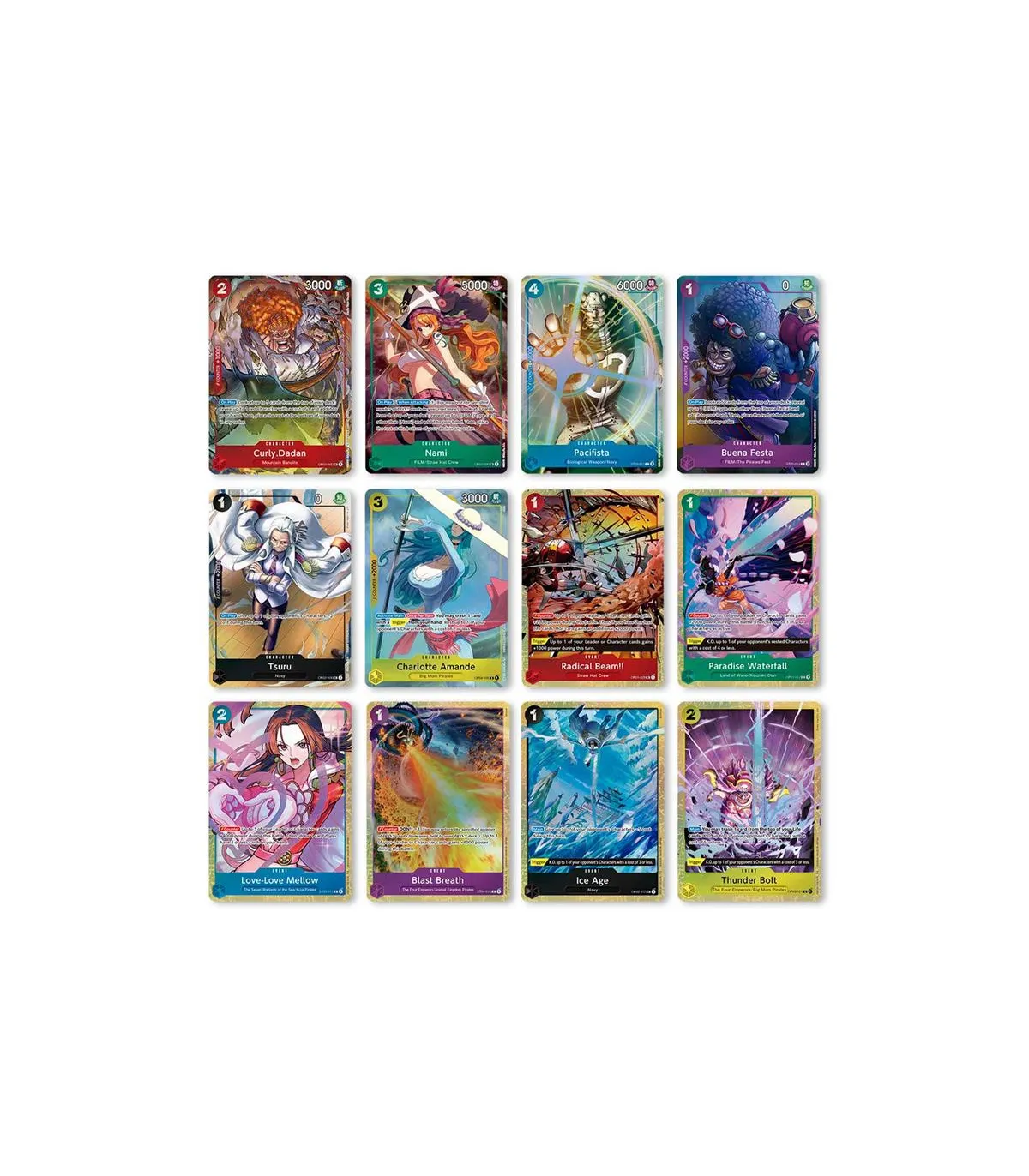 Este álbum contiene: 12 cartas limitadas con un arte alternativo de cartas tan famosas como el Love-Love Mellow, Nami, Tsuru, Charlotte Amande o incluso el famoso Radical Beam!!, entre otras.