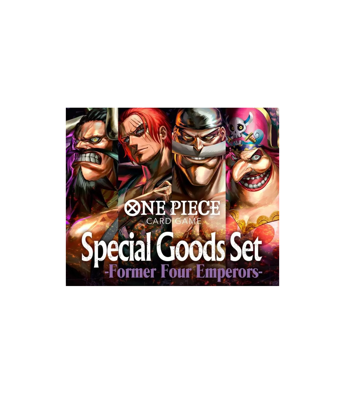 Por fin llega un PACK especial de los 4 temidos emperadores del mar (Yonkou): Shanks, Big Mom, Kaido y Edward Newgate (Whitebeard). Consiste en un tapete con una de las mejores ilustraciones realizadas, una carta alternativa de Edward Newgate líder (OP02-001) y una caja para almacenar cartas con la misma ilustración original exclusiva para One Piece Card.